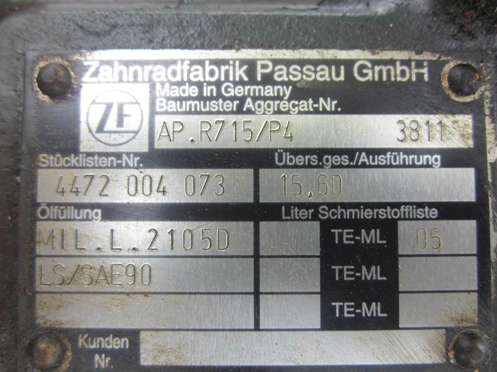 Stock number: 1184Brand: ZFType 1: AP-R715/P4Type 2: AP - R 715 / P4S/N: 3811Machine: Volvo L20 / L25Part number: 4472004073Front axle / Vorderachse / VoorasRatio: 15.60Axles / Achsen / Assen