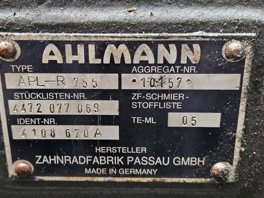 Stock number: 5345Brand: ZFType 1: APL-R755Type 2: APL - R 755S/N: 10157Machine: Ahlmann AZ 14Part number: 4472077069 / 4108670ARear axle / Hinterachse / AchterasAxle / Achse / asAxles / Achsen / Assen